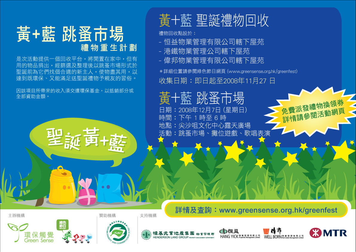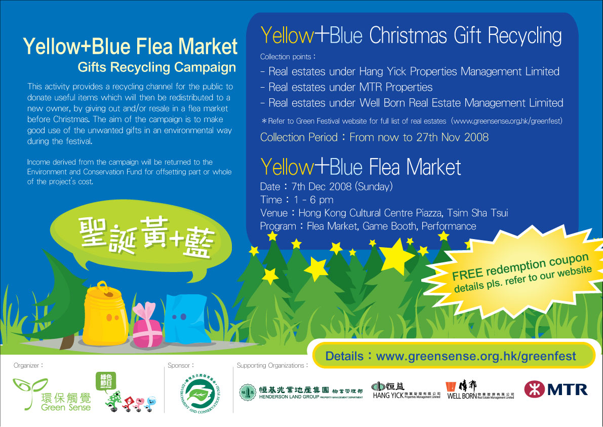 本會將於今年聖誕假尖沙咀文化中心露天廣場舉辦全港性的「聖誕黃+藍 ~ 跳蚤市場」活動,提供一個回收平台,將市民大眾一些閒置在家中但仍有用的物品捐出,經篩選及整理後以跳蚤市場形式於聖誕前為它們找個合適的新主人,使物盡其用,以達到既環保、又能滿足送聖誕禮物予親友的習俗。