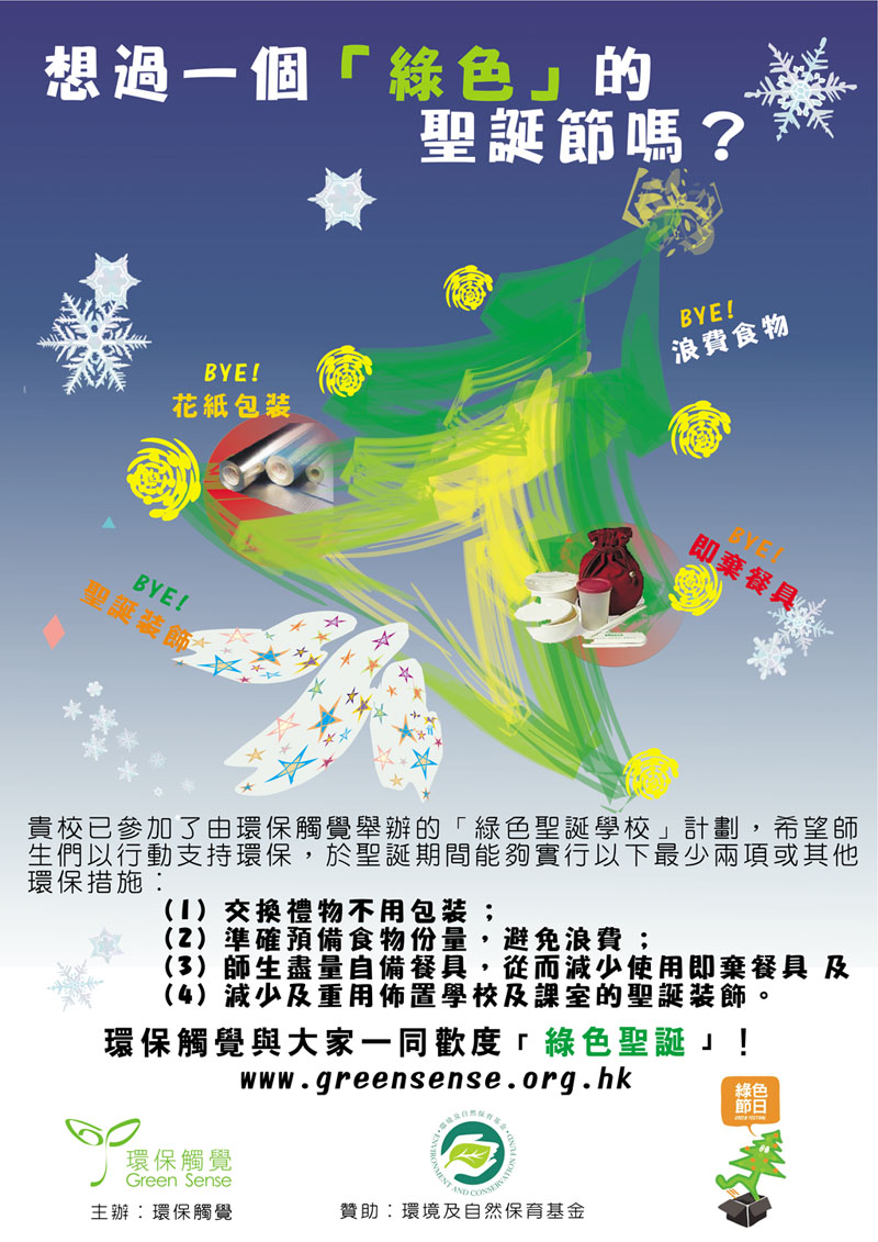 為使學生更懂得珍惜資源,過一個「綠色」的聖誕,環保觸覺特地舉辦了「綠色聖誕學校」計劃。參加學校需要在聖誕聯歡會符合以下最少兩項,包括: