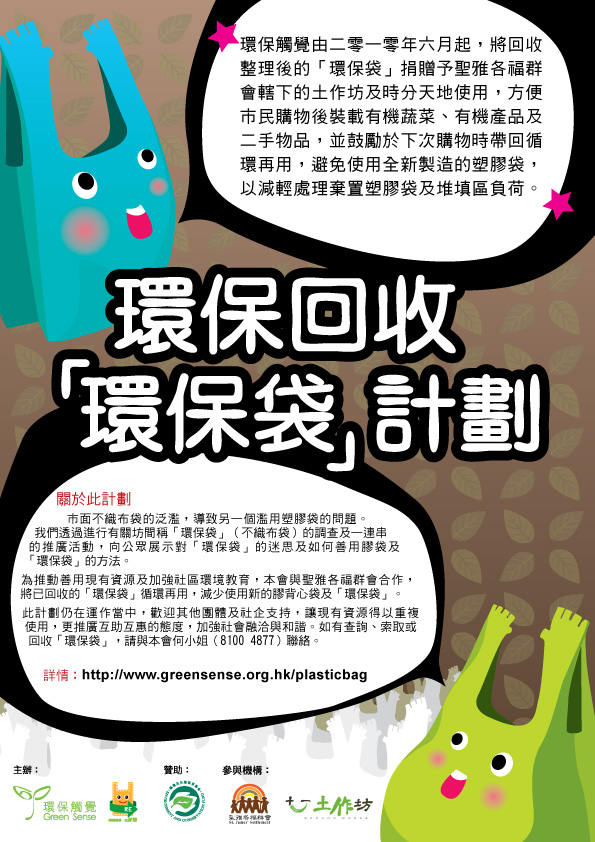 市民家中的「環保袋」數量驚人,為了能重用市民家中過剩的「環保袋」。本會於2010年 3月展開「環保回收環保袋」,在各區中小學幼稚園、超過半百個屋苑及其他公司團體收集近千個「環保袋」,並供慈善團體或社會企業免費領取,用作盛載貨品、紀念品或其他用途。避免使用全新製造的塑膠袋,以減輕處理棄置塑膠袋及堆填區負荷。 *2011年 2月 15 日注 : 本會暫時並不接受不織布袋的回收